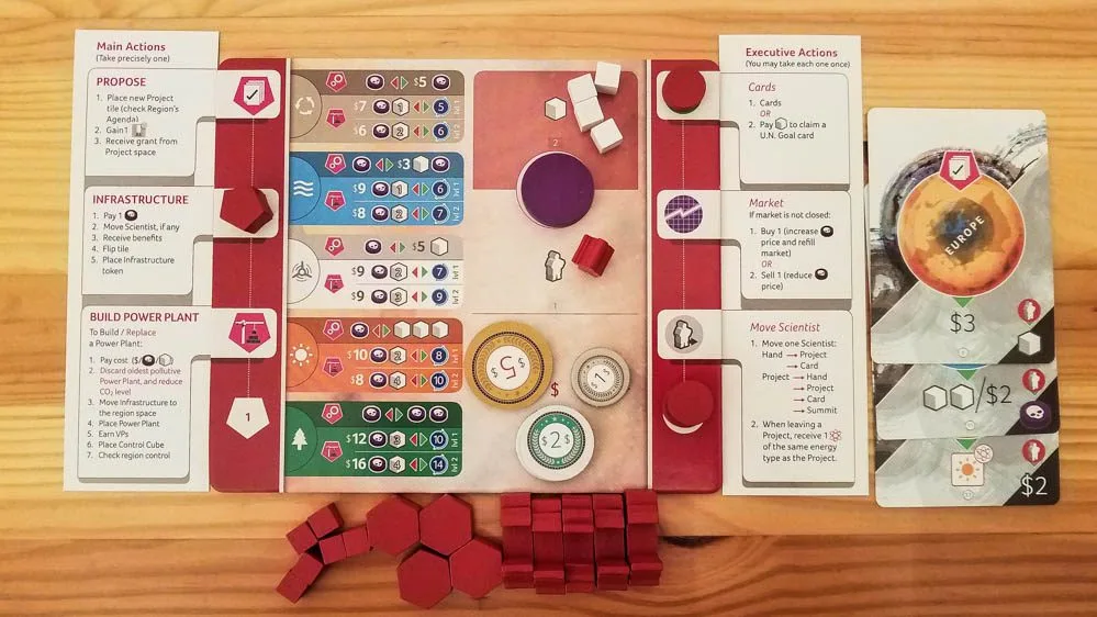 You can also perform one, two, or all three of the Executive actions on your turn. You can play a Lobbyist card or claim a U.N. Goal card, you can move one of your scientists, or you can buy/sell CEPs on the CEP Market.