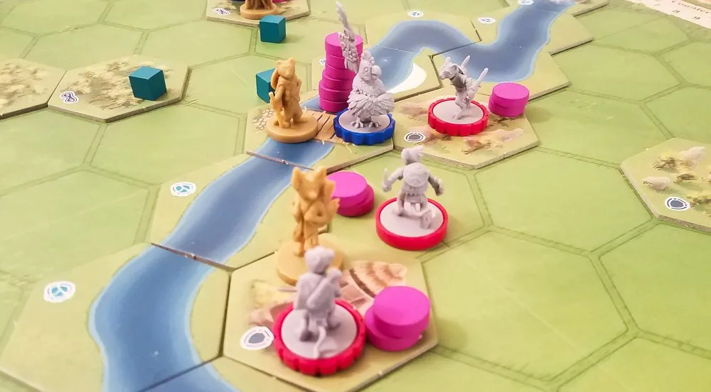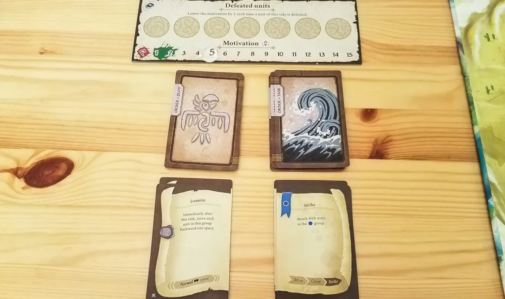 Each animalfolk unit has stats and possibly a special ability. If a unit is attacked and takes damage, you’ll place damage tokens next to them on the board. If their damage meets or exceeds their health stat, they are removed from the board and that army’s motivation goes down by one.