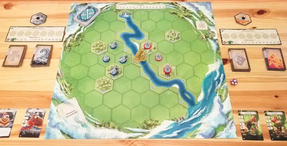 The resource cards that you’ll have can be used in multiple ways. You can look at and possibly reorder cards in the order decks; deck manipulation is the main mechanic in this game. You can also move around the battlefield, use fortification tokens to protect specific locations, or you can use a resource card’s special abilities. You can play as many cards as you want to on your turn, but each card is only used for one of its actions and is then discarded.