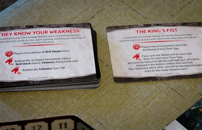 Skill Checks and Saves, which D&D players will recognize from the tabletop RPG, are two keywords you’ll see pretty often in this game. When a card requires you to make a Skill Check, you simply draw your top card and check to see if it matches your character’s color. Encounters have the Save keyword, which is the same as the Skill Check except that you draw and check the top card of that encounter’s Encounter Deck. The cards will tell you what to do on successes or failures.