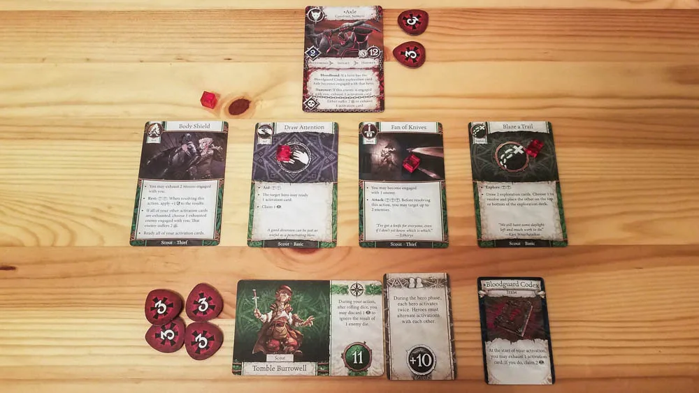 At the beginning of every game of Heroes of Terrinoth, everyone will choose one of the 18 heroes and then you’ll decide which one of the eight quests you want to go on. The quest sheet will tell you how to set up the game and what your objectives are, which usually includes defeating a Nemesis. Each hero has four unique activation cards and a special ability that they’ll be able to use throughout the game.