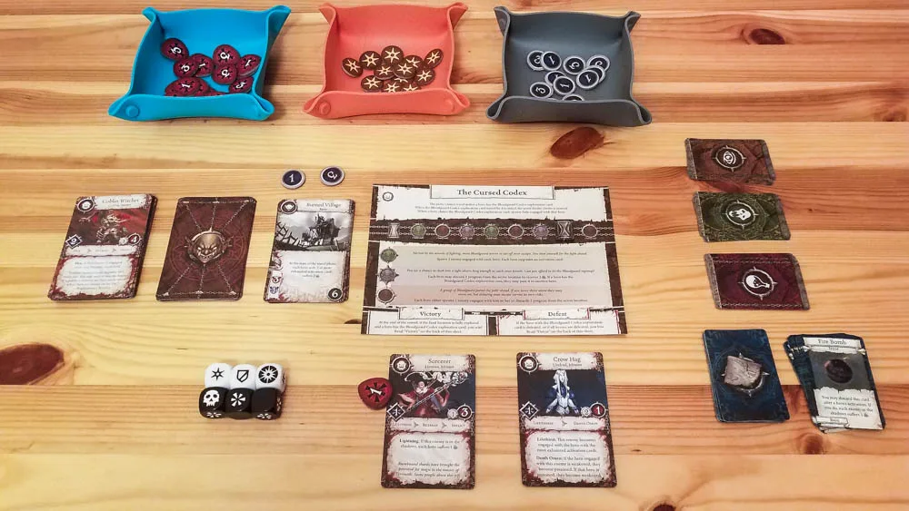 Heroes of Terrinoth is a cooperative fantasy adventure card game in which you play cards and roll dice in hopes of killing enemies and completing quests.