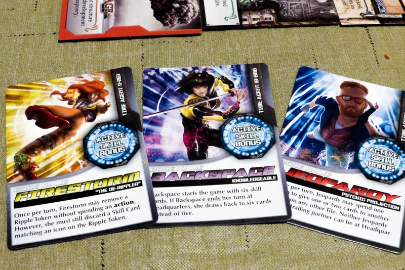 You’ll be taking three actions on each of your turns. These actions include moving, time jumping, drawing Skill cards, sharing cards, removing Ripple tokens, and repairing a tile in crisis.