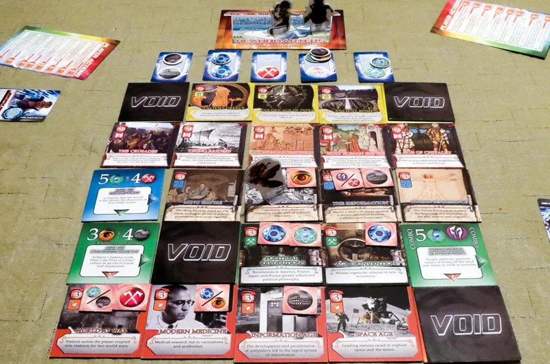 To set up a game of Saving Time, you’ll first lay out the 25 Time Tiles. There are five tiles from each age, which make up the Ancient, Medieval, Early Modern, Modern, and Contemporary eras. You’ll then flip two Crisis cards to determine where the initial crises show up (more on how that works later).