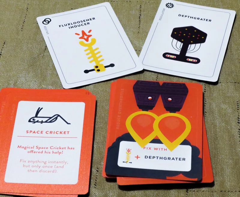 Each Malfunction card will tell you what you will need to fix it. You’ll need those Tool cards, but you might not have them in your hand. You’ll need to scream out to your teammates the names of the cards you need to completely fix those malfunctions. If you do need someone else’s tool, it will need to be passed around the table until someone sitting next to you can give it to you (no passing across the table!). Once you resolve a malfunction, you’ll pick up the tools that were used and move on to the next card.