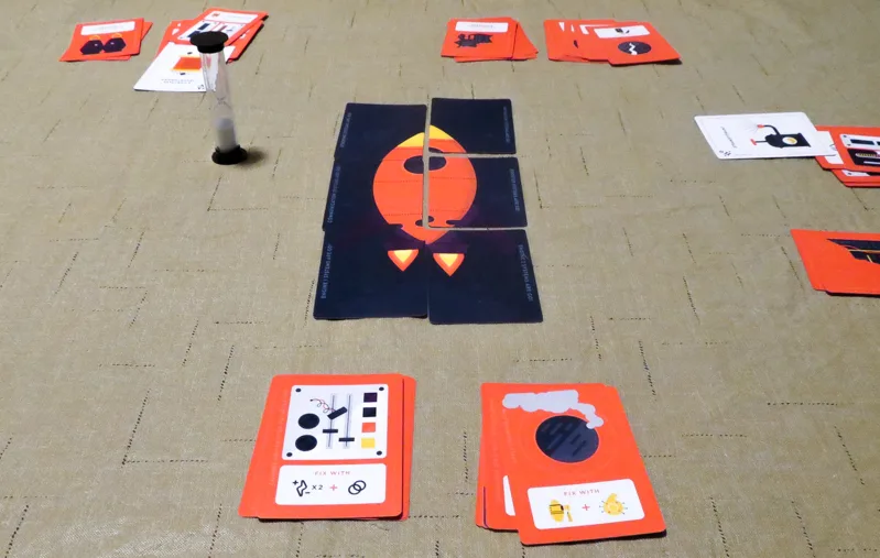 To set up the game, the Tool cards will be evenly dealt out to all players. You’ll make the Malfunction deck based on the number of players and the difficulty level you want to play, mixing in a certain amount of Malfunction cards and Anomaly cards and then shuffling in the Systems Go cards. You’ll then deal out an equal amount of Malfunction cards to each player. Once you’re ready to play, the timer starts, then everyone flips their Malfunction decks and starts to resolve their cards one at a time.