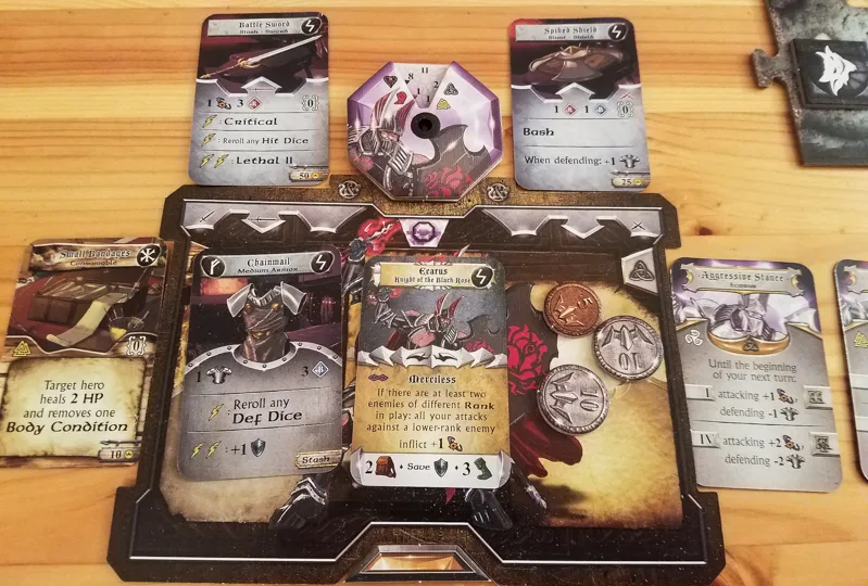 The heroes have their own attributes, innate powers, and power cards. They are further customized by the weapons, armor, and artifacts that they get during the quests.