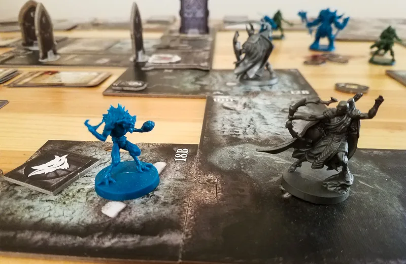 During the Battle Phase, the heroes can decide to activate in any order they choose. They can move around the map, open doors, interact with different items, and fight enemies. Whenever a hero defeats an enemy, that enemy will drop some type of reward. If a hero ever moves within line of sight of an area where there are shadow tokens (hidden enemies), those enemies are revealed, a card is drawn to see what type of enemies they are, and their matching miniatures are placed on the map.