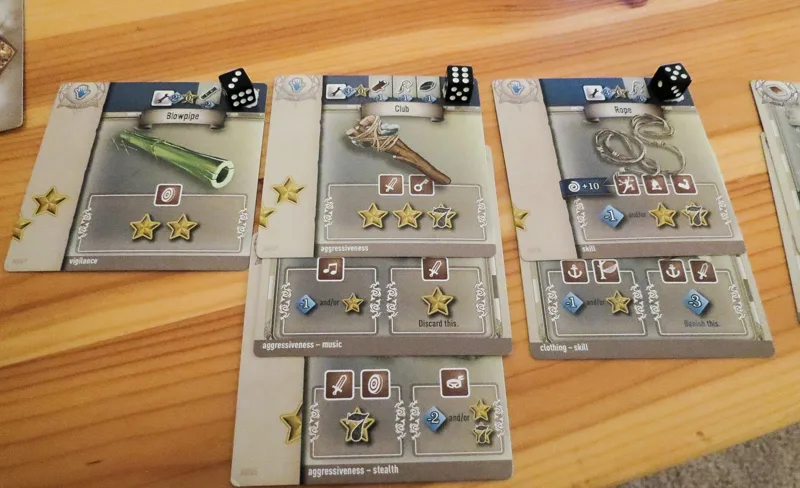 Item cards play a significant role in the game as they make actions easier to perform by lowering the amount of cards and/or successes you’ll need to draw. You’ll have to craft many of the items you get by taking specific actions (drawing more cards from the action deck). The amount of items you can have depends on the number of characters in the game. However, you can stack items on top of each other, making one larger item that uses every ability of the items in that stack.
