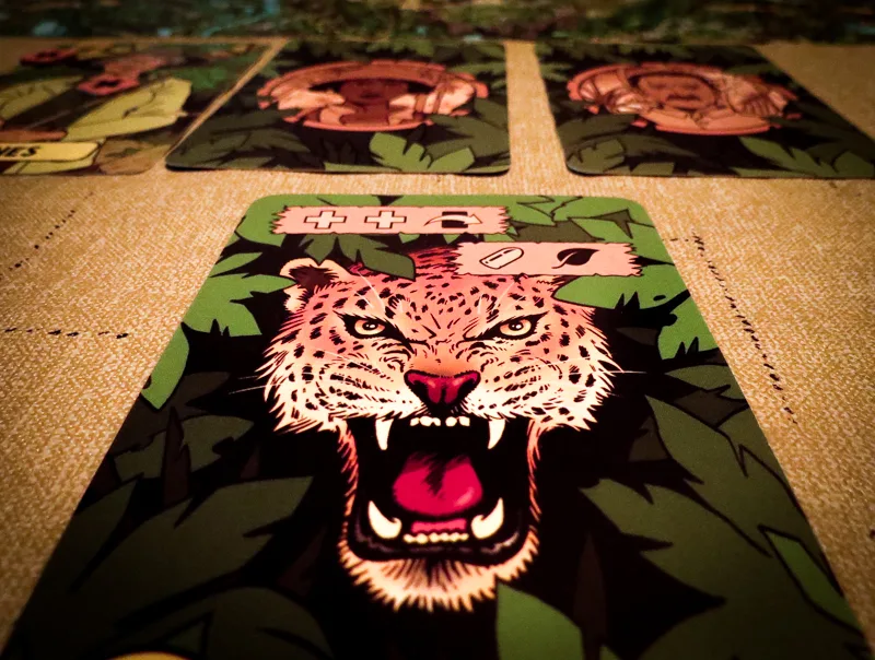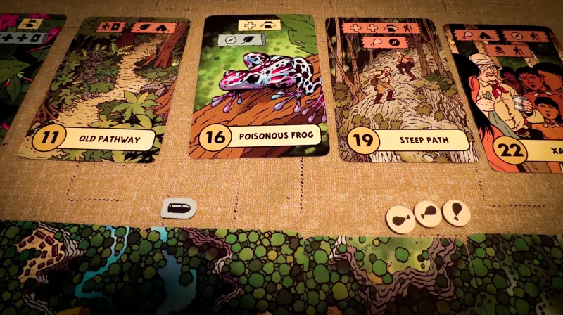 As you move through the jungle, you’ll have to respond to symbols on each adventure card, usually by paying with your resources or discarding an expertise card. The adventure cards have one or more of these boxes on them: