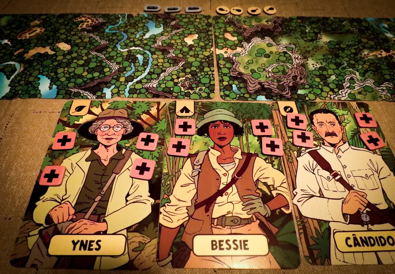 To set up the game, you will place your three explorers out on the table and give them their health tokens. You’ll also lay out 7-9 expedition cards, which represent the distance you’ll have to go to reach El Dorado, and place your team’s meeple on the first card. You will also get some starting food and ammunition.