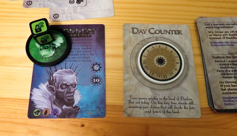 The game is played over a number of days/rounds. Each day you’ll draw an encounter card and choose one of the options listed. Each option lists the tasks that you’ll need to complete and any rewards and progress points that you’ll receive for completing the encounter.